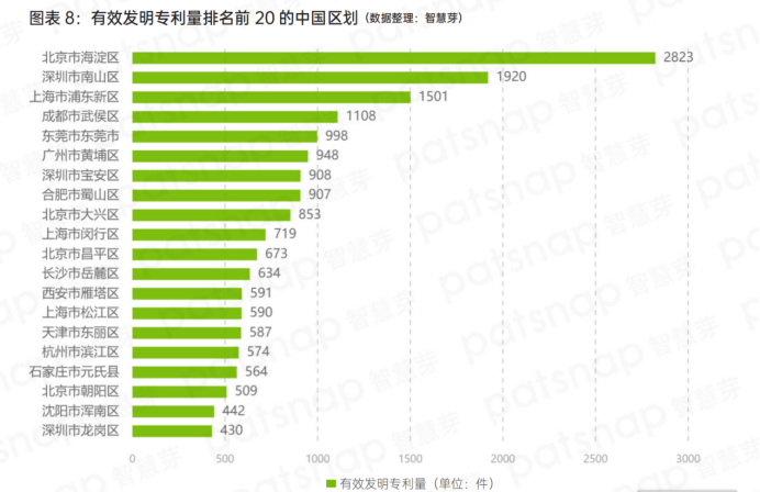 在“專精特新”小巨人企業(yè)專利能力的區(qū)域分布上,如果將顆粒度進一步細分到區(qū),可以看到有效發(fā)明專利量排名前20的分別是,北京市海淀區(qū)、深圳市南山區(qū)、上海市浦東新區(qū)、成都市武侯區(qū)、廣東省東莞市、廣州市黃埔區(qū)、深圳市寶安區(qū)、合肥市蜀山區(qū)、北京市大興區(qū)和上海市閔行區(qū);11-20名的區(qū)域則有北京市昌平區(qū)、長沙市岳麓區(qū)、西安市雁塔區(qū)、上海市松江區(qū)、天津市東麗區(qū)、杭州市濱江區(qū)、石家莊市元氏縣和北京市朝陽區(qū)。
