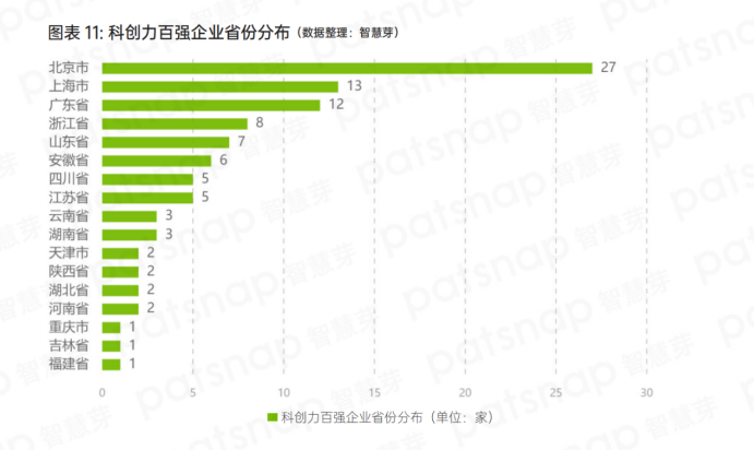 《報告》顯示,科創(chuàng)力排名前100企業(yè)的省份分布中,排名前三的省份分別為北京市、上海市和廣東省,分別有27家、13家和12家企業(yè)上榜。而浙江省、山東省、安徽省和江蘇省分別有 8、7、6、5 家企業(yè)上榜。