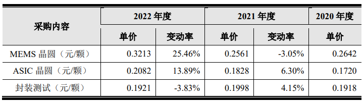 目前,明皜傳感的采購內(nèi)容主要有MEMS晶圓、ASIC晶圓、封裝測試。通過其招股書可以發(fā)現(xiàn),晶圓類材料價(jià)格在去年漲價(jià)幅度較大。其解釋為: