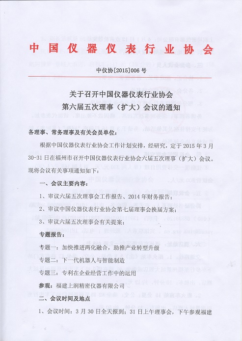 關于召開中國儀器儀表行業協會第六屆五次理事(擴大)