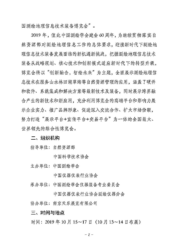 由中國測繪學會、中國儀器儀表行業(yè)協(xié)會主辦的第九屆中國測繪地理信息技術裝備博覽會定于2019 年10 月15 至17 日在江蘇省南京市舉行。博覽會將與中國測繪學會2019 年學術年會同期舉辦。