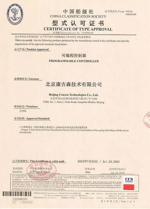 北京康吉森自主知識產(chǎn)權(quán)產(chǎn)品TSxPlus系統(tǒng)于近期順利通過中國船級社(CCS)認(rèn)證,并取得了CCS頒發(fā)的中國船級社型式認(rèn)可證書。