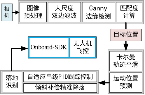 針對(duì)上述問(wèn)題,科研人員設(shè)計(jì)并實(shí)現(xiàn)了基于視覺技術(shù)的車載無(wú)人機(jī)系統(tǒng)。此無(wú)人機(jī)搭載在地面的排爆機(jī)器人上,可根據(jù)需要一鍵起飛,并且能實(shí)時(shí)跟蹤地面機(jī)器人進(jìn)行協(xié)同飛行,為地面機(jī)器人提供第三視角。也可以遙控進(jìn)行遠(yuǎn)程偵查,主動(dòng)目標(biāo)搜索,對(duì)現(xiàn)場(chǎng)環(huán)境進(jìn)行預(yù)先判斷,抓取作業(yè)時(shí)可為操作手提供第三視角進(jìn)行輔助等。執(zhí)行完任務(wù)后無(wú)人機(jī)可一鍵自主返航,并且精確降落在地面機(jī)器人平臺(tái)上,然后隨機(jī)器人一同返回。該研究得到了國(guó)家重點(diǎn)研發(fā)計(jì)劃的支持。