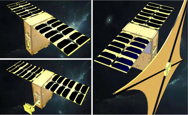 在國家自然科學基金、國家“萬人計劃”、中國科學院“百人計劃”等項目資助下,沈陽自動化所從2011年開始,便開展了空間柔性展開機構的相關研發工作,“天帆一號”是其中第一款飛行產品?!疤旆惶枴碧柗珜⑷嵝阅ふ郫B存儲在展開機構內部,發射前大小不到0.5U,在瀟湘一號07星衛星平臺正常入軌之后,通過兩級組合展開的方式開展技術驗證。一級展開釋放采用了熱切割和被動釋放機構,通過儲能裝置將太陽帆帆體從衛星平臺中推出并翻轉90度;二級展開機構采用主動驅動伸出四根雙穩態帆桁,逐漸展開聚酰亞胺帆膜形成光帆,帆膜展開尺寸約為0.6平方米。