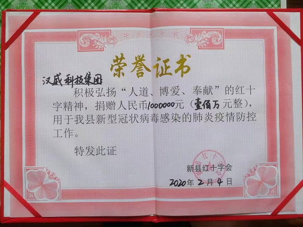 2月3日,漢威科技集團股份有限公司向信陽新縣紅十字會捐贈資金100萬元,專項用于該地區購買新型冠狀病毒肺炎急需的醫療物資及滿足該地區部分緊急現金需求,為保護革命老區人民群眾生命安全健康、為堅決打贏疫情防控阻擊戰貢獻綿薄之力。