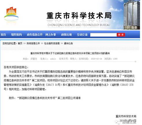 為全面落實習近平總書記關于打贏疫情防控狙擊戰的重要指示精神和黨中央決策部署,堅決迅速響應和落實市委、市政府有關工作要求,積極落實《加強新型冠狀病毒感染肺炎協同攻關強化突發疫情防控科技支撐的若干舉措》的有關措施,發揮科技攻關在新型冠狀病毒感染肺炎防控的支撐作用,重慶市科學技術局啟動了新型冠狀病毒感染肺炎疫情應急科技攻關工作。