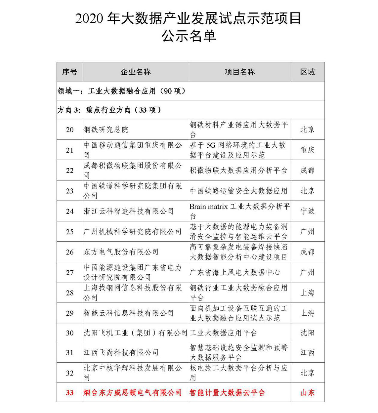 近日,工業(yè)和信息化部辦公廳公布了2020年度大數(shù)據(jù)產(chǎn)業(yè)發(fā)展試點示范項目名單,煙臺東方威思頓電氣有限公司自主研發(fā)的“智能計量大數(shù)據(jù)云平臺”名列其中。