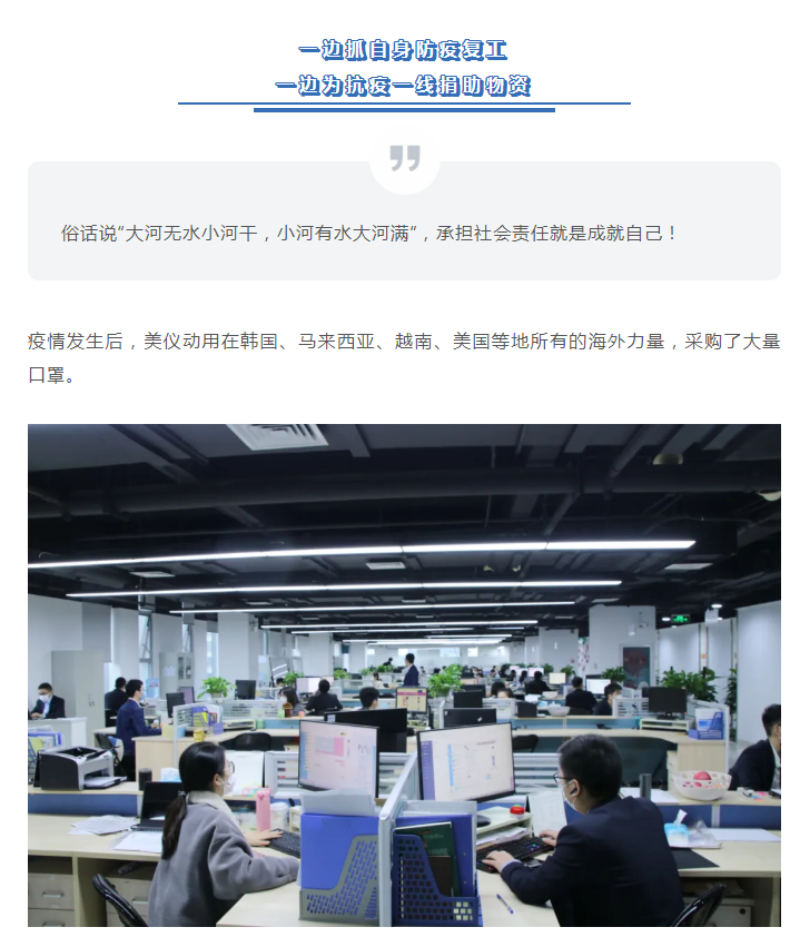 除企業(yè)自用外,美儀還第一時(shí)間向浙江大學(xué)醫(yī)學(xué)院附屬邵逸夫醫(yī)院和武漢市中心醫(yī)院捐贈(zèng)口罩,并向新區(qū)慈善總會(huì)捐贈(zèng)20萬元支援疫情一線。