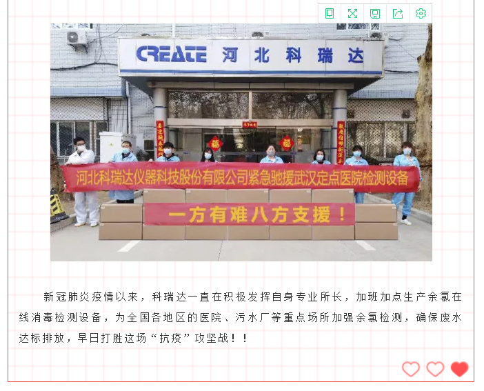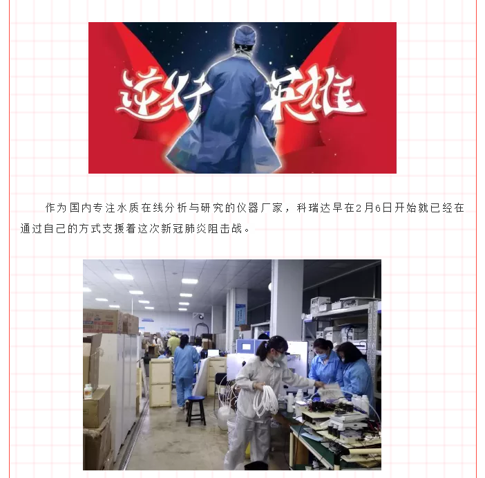 2月9日,第一時間與園區(qū)領導申請復工復產(chǎn)。加班加點,生產(chǎn)余氯在線分析儀,2月12日派物資專車馳援武漢,2月13日到達龔家?guī)X收費站,完成無接觸交貨;