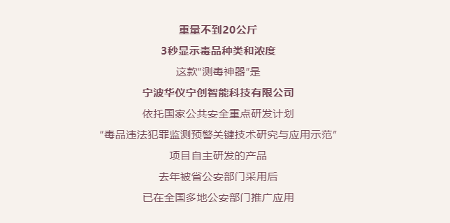 近日,全國禁毒工作電視電話會議提出“強化禁毒科技攻關,有效提升毒品檢驗鑒定能力”,這個“利好”意味著該產品市場前景廣闊,這讓華儀寧創總經理兼總工程師聞路紅很興奮。