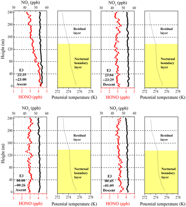 HONO作為OH自由基的重要前體物,其光解貢獻(xiàn)了日間25%–60%的OH自由基,在大氣光化學(xué)反應(yīng)過程中扮演著重要作用。盡管對大氣HONO的研究已有幾十年的歷史,其詳細(xì)的形成機(jī)理仍存在爭議,夜間地表面和氣溶膠表面的HONO生成仍是研究的熱點之一。因此,針對北京市高霧霾污染狀況,開展夜間HONO垂直梯度研究,研究不同污染階段夜間地表面和氣溶膠表面的HONO生成,對了解夜間大氣HONO生成機(jī)制具有重要意義。