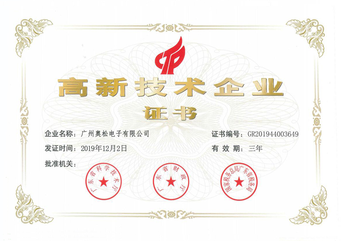 2020年4月13日,廣州奧松電子有限公司在去年12初復審的“高新技術企業證書”正式審批發放。據悉,2016年,科技部、財政部、國家稅務總局三部門對2008年的高新認定管理辦法及工作指引進行了重新修訂,高新技術企業認定與舊的政策相比,申請門檻提高了不少,所以高新技術企業的認證并不好通過。