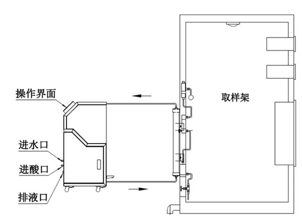取樣架上發生樹脂失效時,運行管路直接連接到再生裝置上,再生裝置上預留兩個樹脂柱安裝位,可存放新樹脂柱,保證系統運行取樣的連續不間斷;空出的失效樹脂柱與再生裝置連接,啟動再生升系統,等待系統完成再生即可更換到主用樹脂柱上繼續運行取樣。