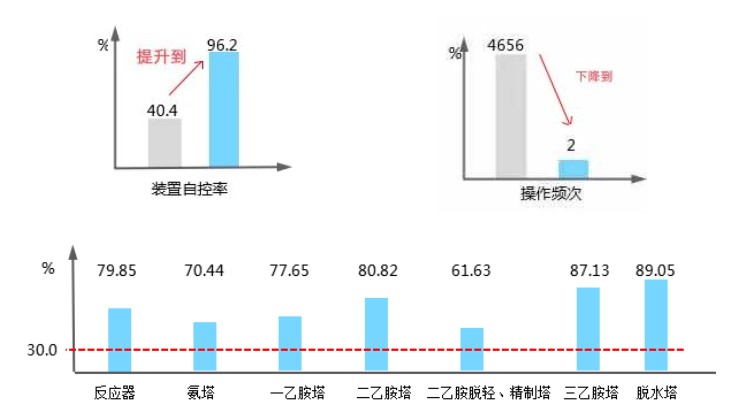 2019年11月,該項(xiàng)目順利通過(guò)專家組驗(yàn)收。APC系統(tǒng)應(yīng)用后,控制器投運(yùn)率達(dá)98.8%,裝置自控率提升至96.2%;操作頻次由原來(lái)的4656次/5天降低至2次/5天,大大降低了操作人員的勞動(dòng)強(qiáng)度;在裝置穩(wěn)定優(yōu)化運(yùn)行的基礎(chǔ)上,裝置單位產(chǎn)品蒸汽消耗降低了1.7%以上,實(shí)現(xiàn)了節(jié)能降耗。