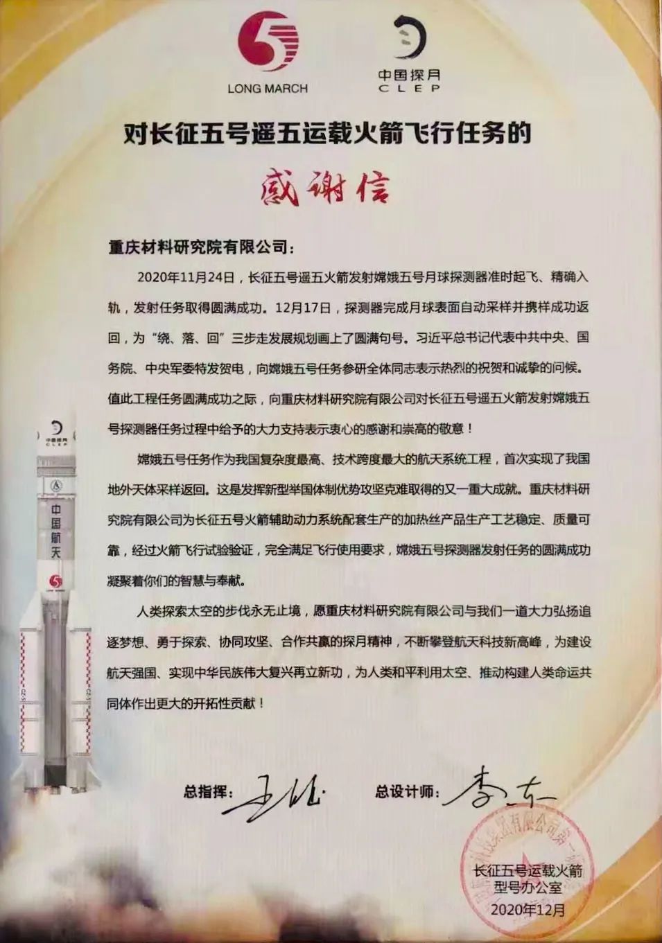 近日,重慶材料研究院有限公司(下簡(jiǎn)稱“重材院”)收到了一封特別的感謝信,來(lái)自我國(guó)長(zhǎng)征五號(hào)運(yùn)載火箭型號(hào)辦公室。信中提到:“重材院加熱絲產(chǎn)品生產(chǎn)工藝穩(wěn)定、質(zhì)量可靠,經(jīng)過(guò)火箭飛行實(shí)驗(yàn)驗(yàn)證,完全滿足飛行使用要求。”