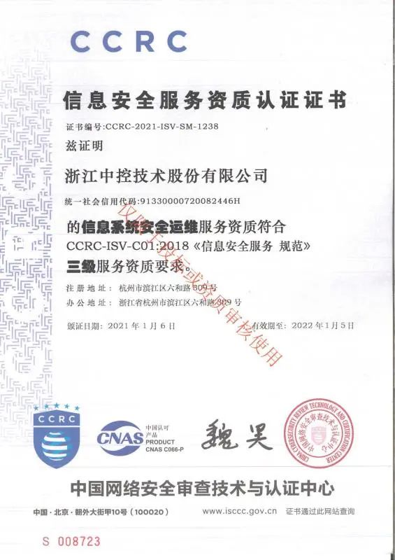 近期,中控技術成功取得信息安全的服務認證——安全集成、安全運維、風險評估方向三級(中國網絡安全審查技術與認證中心)及信息安全服務資質——安全工程類一級(中國信息安全測評中心)兩項資質。