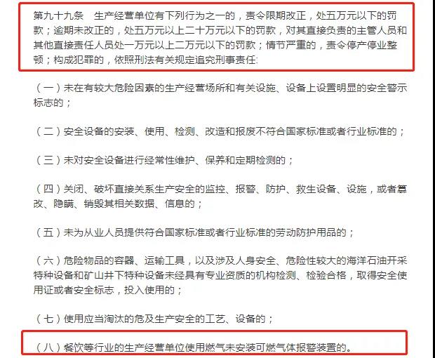 即將于9月1日正式施行的《中華人民共和國安全生產(chǎn)法》第三十六條明確規(guī)定,“餐飲等行業(yè)的生產(chǎn)經(jīng)營單位使用燃氣的,應當安裝可燃氣體報警裝置,并保障其正常使用”。