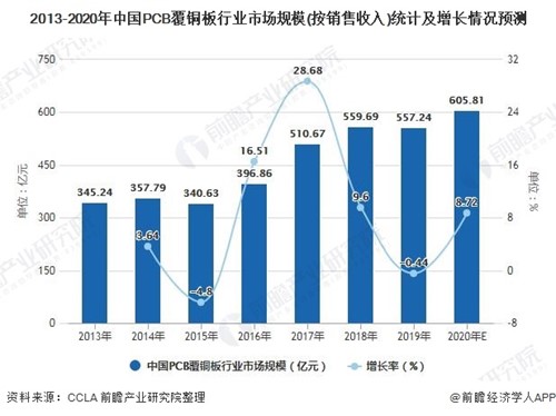 2013-2020年中國PCB覆銅板行業(yè)市場規(guī)模(按銷售收入)統(tǒng)計(jì)及增長情況預(yù)測