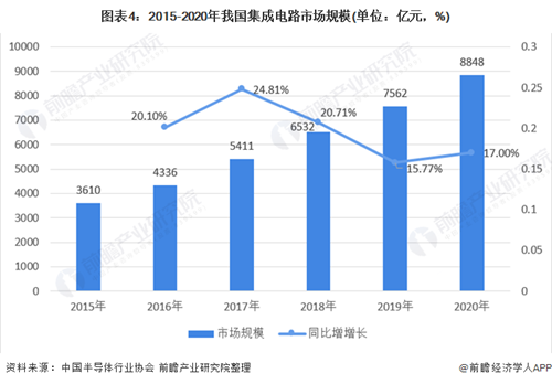 根據中國半導體行業協會數據顯示,2015-2020年我國集成電路市場規模呈逐年增加趨勢。2020年我國集成電路市場規模為8848億元,較2019年增加17.00%。