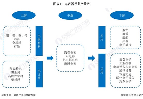 電容器產業鏈上游為電極材料和電解質材料行業,下游行業主要應用于軍用和民用領域,軍用領域包括航空、航天、艦船、兵器、電子對抗等,民用領域包括消費電子、工業控制、電力設備及新能源、通訊設備、軌道交通、醫療電子設備及汽車電子等。