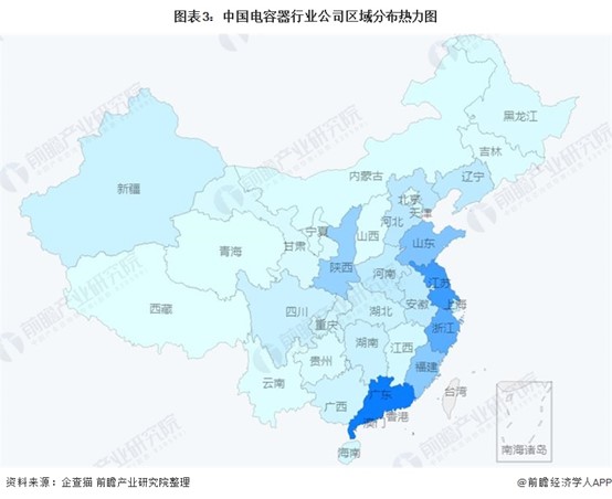 電容器行業產業鏈區域熱力地圖:企業集中于廣東省、江蘇省、浙江省