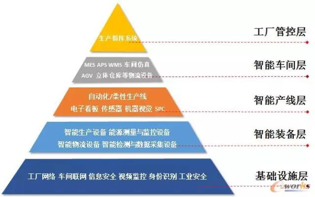 智能工廠可以分為基礎設施層、智能裝備層、智能產線層、智能車間層和工廠管控層五個層級:
