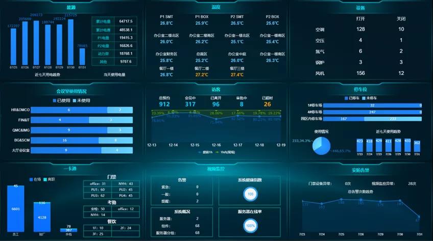 智慧工廠要求對(duì)園區(qū)的視頻監(jiān)控、安防報(bào)警、人員巡查、門禁考勤、訪客管理、一卡通管理、停車位、會(huì)議室、信息發(fā)布、能源使用情況、環(huán)境變化、設(shè)備參數(shù)等工作進(jìn)行實(shí)時(shí)在線的統(tǒng)一管理,企業(yè)可利用傳感器技術(shù)實(shí)現(xiàn)動(dòng)態(tài)捕捉、熱成像報(bào)警、人臉識(shí)別、溫濕度感應(yīng)等,再利用OA或報(bào)表系統(tǒng)實(shí)現(xiàn)在線巡檢、信息發(fā)布、會(huì)議室線上預(yù)約、訪客線上登記等,將系統(tǒng)數(shù)據(jù)和傳感器數(shù)據(jù)利用微服務(wù)接口的方式進(jìn)行調(diào)用,形成園區(qū)全貌管理指標(biāo),最后利用3D建模技術(shù)開(kāi)發(fā)智慧園區(qū)全局管理模型或利用數(shù)據(jù)分析工具制作園區(qū)綜合管理駕駛艙,實(shí)現(xiàn)對(duì)園區(qū)資源的統(tǒng)一高效管理,打造綠色、高效、安全的智慧園區(qū)。