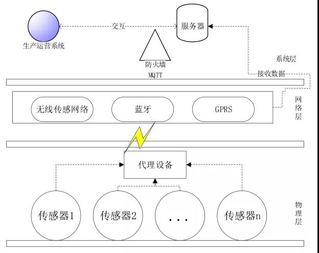 生產(chǎn)運(yùn)營(yíng)系統(tǒng)的技術(shù)框架分為三層:物理層、網(wǎng)絡(luò)層、系統(tǒng)層。其中,物理層負(fù)責(zé)數(shù)據(jù)采集,主要通過(guò)布置在生產(chǎn)現(xiàn)場(chǎng)的傳感器或者PLC對(duì)數(shù)據(jù)進(jìn)行采集;網(wǎng)絡(luò)層負(fù)責(zé)數(shù)據(jù)的傳輸;系統(tǒng)層主要包括服務(wù)端和應(yīng)用端,是整個(gè)系統(tǒng)的軟件部分。