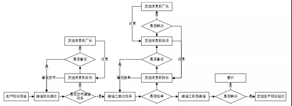 維修工接單后,到達(dá)指定位置對(duì)設(shè)備維修,維修結(jié)束后發(fā)送維修完成的消息給生產(chǎn)班長(zhǎng)進(jìn)行驗(yàn)收,驗(yàn)收通過(guò)后由生產(chǎn)班長(zhǎng)結(jié)束流程。在報(bào)修流程中有幾個(gè)關(guān)鍵點(diǎn)是保證維修任務(wù)及時(shí)完成的關(guān)鍵點(diǎn):