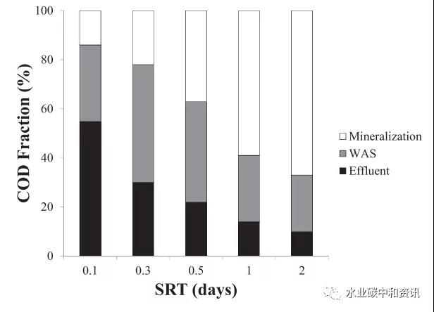 在較SRT和HRT下運行時,產量接近其最大值,因而可在接近最大污泥產率情況下,可最優地利用COD產出生物質。在這些運行條件下,與傳統HRAS工藝相比,其去除大部分(50~80%)進水COD時所需求的曝氣量減少近60%。