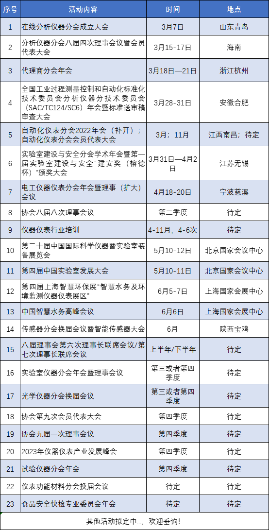 中國儀器儀表行業協會2023年度主要活動安排