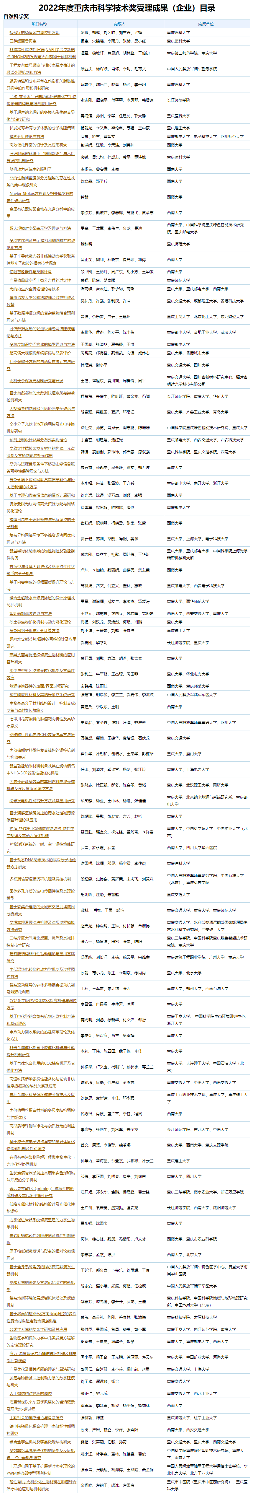 近日,2022年度重慶市科學(xué)技術(shù)獎(jiǎng)提名工作已結(jié)束,重慶市科學(xué)技術(shù)獎(jiǎng)勵(lì)工作辦公室共受理有關(guān)單位和專家提名的重慶市科學(xué)技術(shù)獎(jiǎng)成果(企業(yè))575項(xiàng),現(xiàn)進(jìn)行公示,其中自然科學(xué)獎(jiǎng)104項(xiàng)、技術(shù)發(fā)明獎(jiǎng)24項(xiàng)、科技進(jìn)步獎(jiǎng)434項(xiàng)、企業(yè)技術(shù)創(chuàng)新獎(jiǎng)13項(xiàng)。