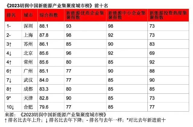 6月19日發布的《2023胡潤中國新能源產業集聚度城市榜》(以下簡稱榜單)顯示,深圳、上海、蘇州位列前三,北京、常州則并列第四,廣州、武漢、成都、天津和合肥分列6-10位。