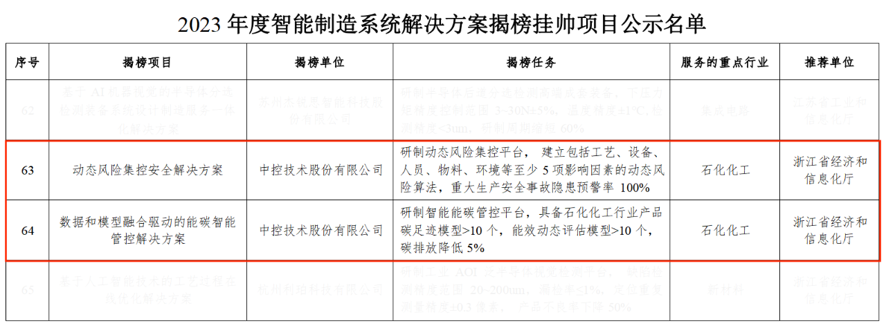 近日,中控技術(shù)股份有限公司(以下簡稱“中控技術(shù)”)的“動態(tài)風(fēng)險集控安全解決方案”和“數(shù)據(jù)和模型融合驅(qū)動的能碳智能管控解決方案”成功入選國家工信部公示的“2023年度智能制造系統(tǒng)解決方案揭榜掛帥項(xiàng)目名單”。
