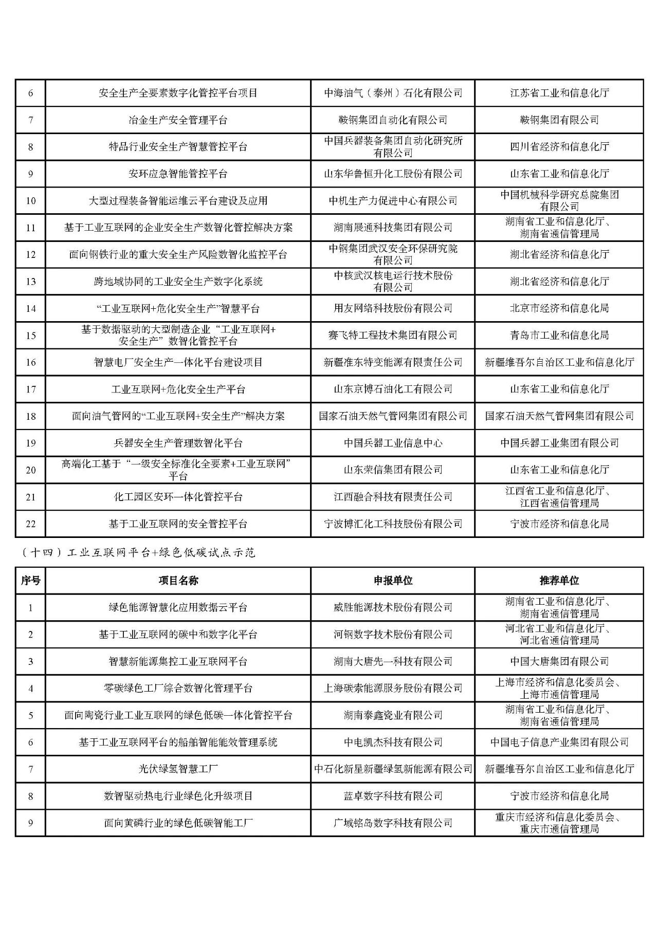 為深入貫徹《國務院關于深化“互聯網+先進制造業”發展工業互聯網的指導意見》,根據《工業和信息化部辦公廳關于組織開展2023年工業互聯網試點示范項目申報工作的通知》(工信廳信管函﹝2023﹞319號),經企業申報、地方推薦、專家評審,形成2023年工業互聯網試點示范名單。現予以公示,歡迎社會各界監督。如有異議,請在公示期內與我們聯系。