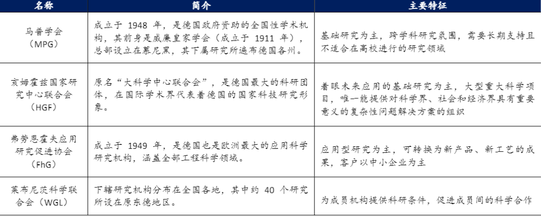 除弗勞恩霍夫協(xié)會外,德國還有馬普學(xué)會、亥姆霍茲國家研究中心聯(lián)合會和萊布尼茨科學(xué)聯(lián)合會三大國家科研組織,分別在基礎(chǔ)研究、未來應(yīng)用研究、促進(jìn)研究機(jī)構(gòu)間的科學(xué)溝通等領(lǐng)域發(fā)揮作用。四大骨干科研組織為戰(zhàn)后德國工業(yè)的發(fā)展起到了重要的支撐作用。