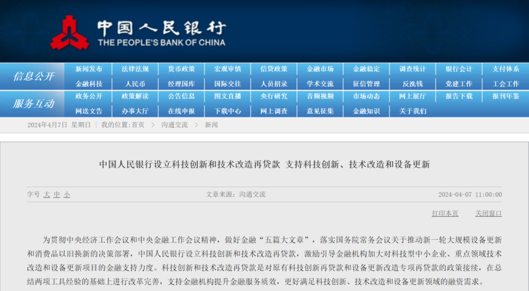 4月7日,據央行官網消息,為貫徹中央經濟工作會議和中央金融工作會議精神,做好金融“五篇大文章”,落實國務院常務會議關于推動新一輪大規(guī)模設備更新和消費品以舊換新的決策部署,中國人民銀行設立科技創(chuàng)新和技術改造再貸款,激勵引導金融機構加大對科技型中小企業(yè)、重點領域技術改造和設備更新項目的金融支持力度。