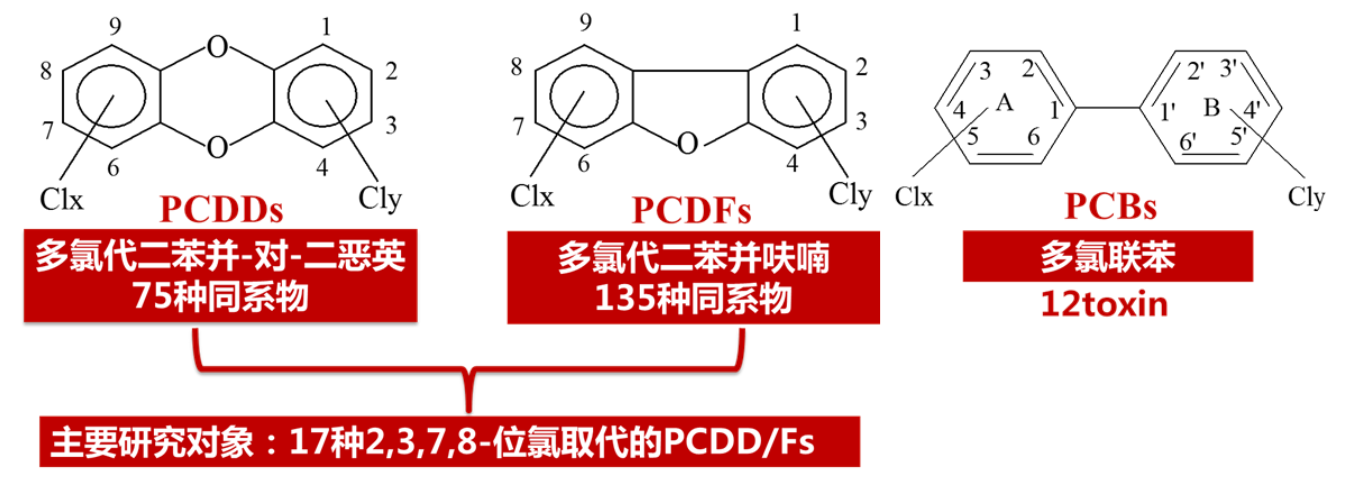 二噁英及其類似物是一類含有苯環(huán)結(jié)構(gòu)的特定有機(jī)化合物的總稱,包括多氯代二苯并二噁英(PCDDs)和多氯代二苯并呋喃(PCDFs)和類二噁英多氯聯(lián)苯(DL-PCBs)等,具有持久性、生物富集、長距離遷移和生物毒性等特點(diǎn)。其中以17種2,3,7,8位氯取代的PCDD/Fs和12種DL-PCBs同族體被認(rèn)為對人類和生物危害最嚴(yán)重。