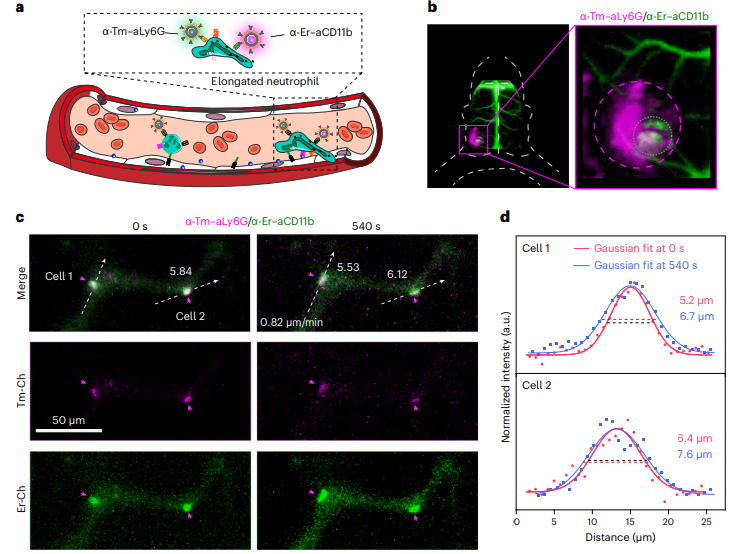 其中,團(tuán)隊(duì)利用開發(fā)的新型近紅外二區(qū)稀土熒光探針特異性的標(biāo)記了小鼠的中性粒細(xì)胞以研究炎癥血管中活化中性粒細(xì)胞的體內(nèi)成像(圖2)。中性粒細(xì)胞能夠在血管內(nèi)壁爬行到外滲部位,然后外滲是中性粒細(xì)胞活化的典型特征。CD11b是一種介導(dǎo)細(xì)胞粘附和遷移的中性粒細(xì)胞表面蛋白,在活化的中性粒細(xì)胞表面表達(dá)上調(diào)。中性粒細(xì)胞上Ly6G和CD11b蛋白的雙重標(biāo)記有助于在體內(nèi)特異性地跟蹤活化的中性粒細(xì)胞。因此,在缺血性腦卒中小鼠模型中,靜脈注射抗ly6g抗體偶聯(lián)的α-TmNPs和抗cd11b抗體偶聯(lián)的α-ErNPs (α-Er-aCD11b),標(biāo)記活化的中性粒細(xì)胞,雙標(biāo)記的中性粒細(xì)胞表現(xiàn)出微弱的運(yùn)動(dòng)、滾動(dòng)和爬行,表明它們?cè)趦?nèi)皮細(xì)胞表面粘附牢固。此外,可以觀察到雙標(biāo)記的中性粒細(xì)胞,沿著血流的剪切力被拉長(zhǎng),這通常被認(rèn)為是中性粒細(xì)胞通過炎癥血管外滲的最后一步。