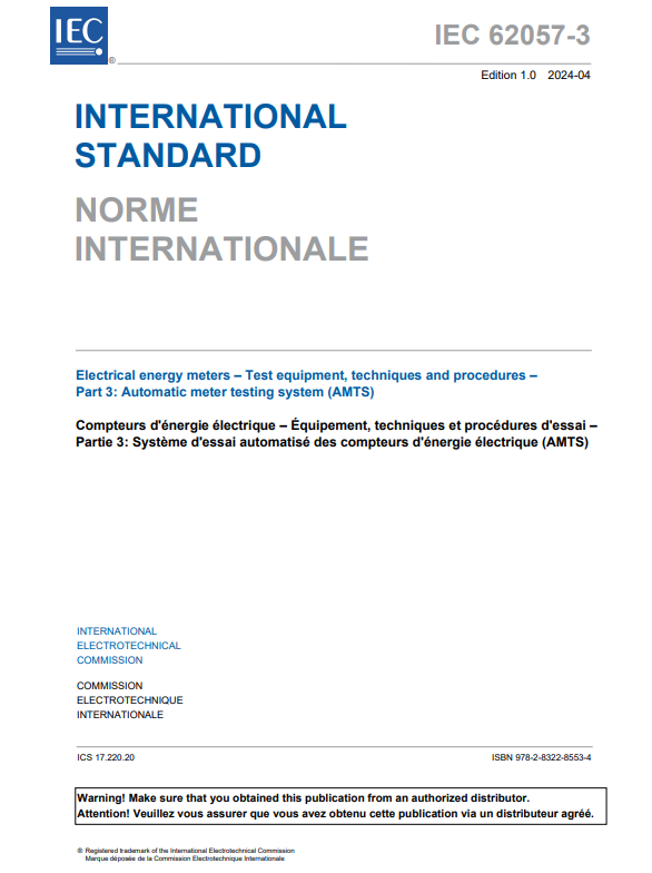 由我國主導制定的國際標準《IEC 62057-3電能表測試設備、技術和步驟 第3部分:電能表自動化試驗系統(AMTS)》于2024423日正式由國際電工委員會(IEC)發布,這是中國首次在電能計量領域主導制定IEC國際標準。