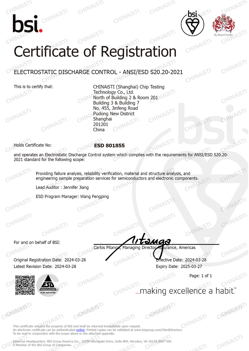 本次審核,BSI英標(biāo)管理體系認(rèn)證評(píng)審團(tuán)隊(duì)嚴(yán)格按照ANSI/ESD S20.20:2021標(biāo)準(zhǔn)執(zhí)行,對(duì)蘇試宜特在ESD體系的建立、EPA的建立、敏感器件的包裝、生產(chǎn)各環(huán)節(jié)的處理、人員培訓(xùn)和考核、內(nèi)審制度的建立和檢查、檢測(cè)手段等各方面的ESD管理進(jìn)行了全面、細(xì)致的審查。歷經(jīng)數(shù)輪嚴(yán)格審查后,蘇試宜特靜電防護(hù)體系符合各項(xiàng)審核標(biāo)準(zhǔn),獲頒認(rèn)證證書(shū)。