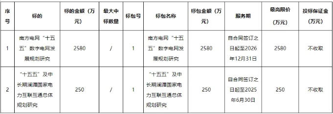5月6日,南方電網公司“十五五”電網規劃專題公開招標。招標含兩個標的,南方電網“十五五”數字電網發展規劃研究、“十五五”及中長期瀾湄國家電力互聯互通總體規劃研究,前者最高限價2580萬元,后者最高限價250萬元。