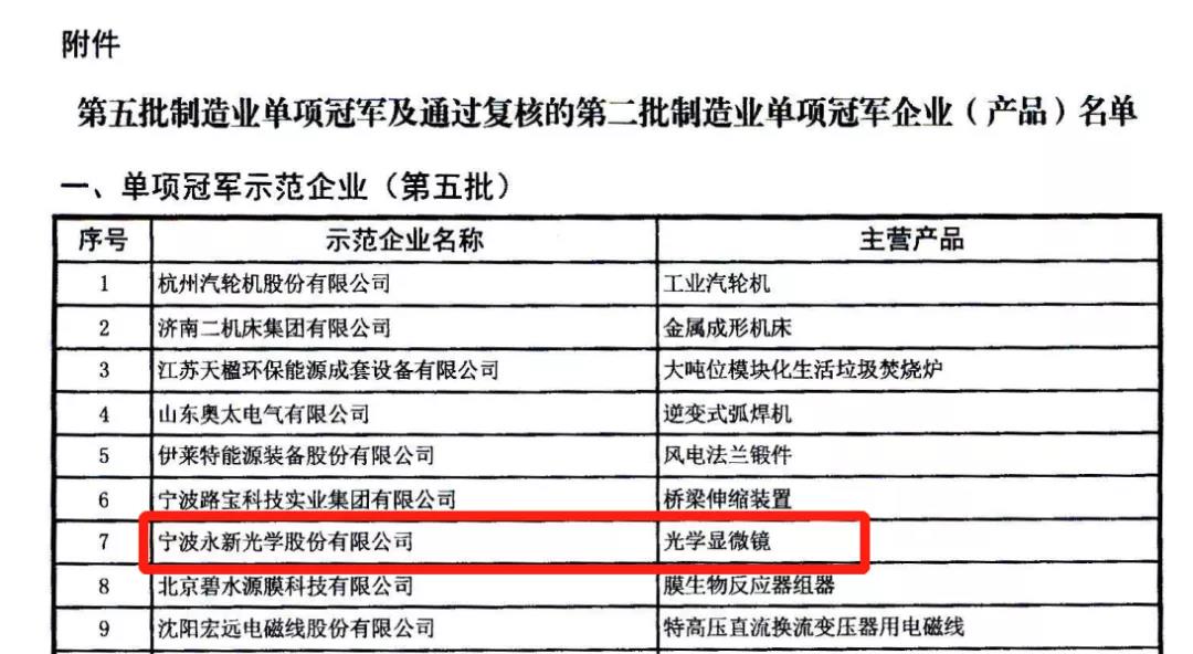 近日,工業(yè)和信息化部和中國工業(yè)經(jīng)濟聯(lián)合會公布了第五批制造業(yè)單項冠軍及通過復(fù)核的第二批制造業(yè)單項冠軍企業(yè)(產(chǎn)品)名單(工信部聯(lián)政法函〔2020〕351號),寧波永新光學(xué)股份有限公司成功復(fù)評升級為第五批國家級制造業(yè)“單項冠軍示范企業(yè)”。