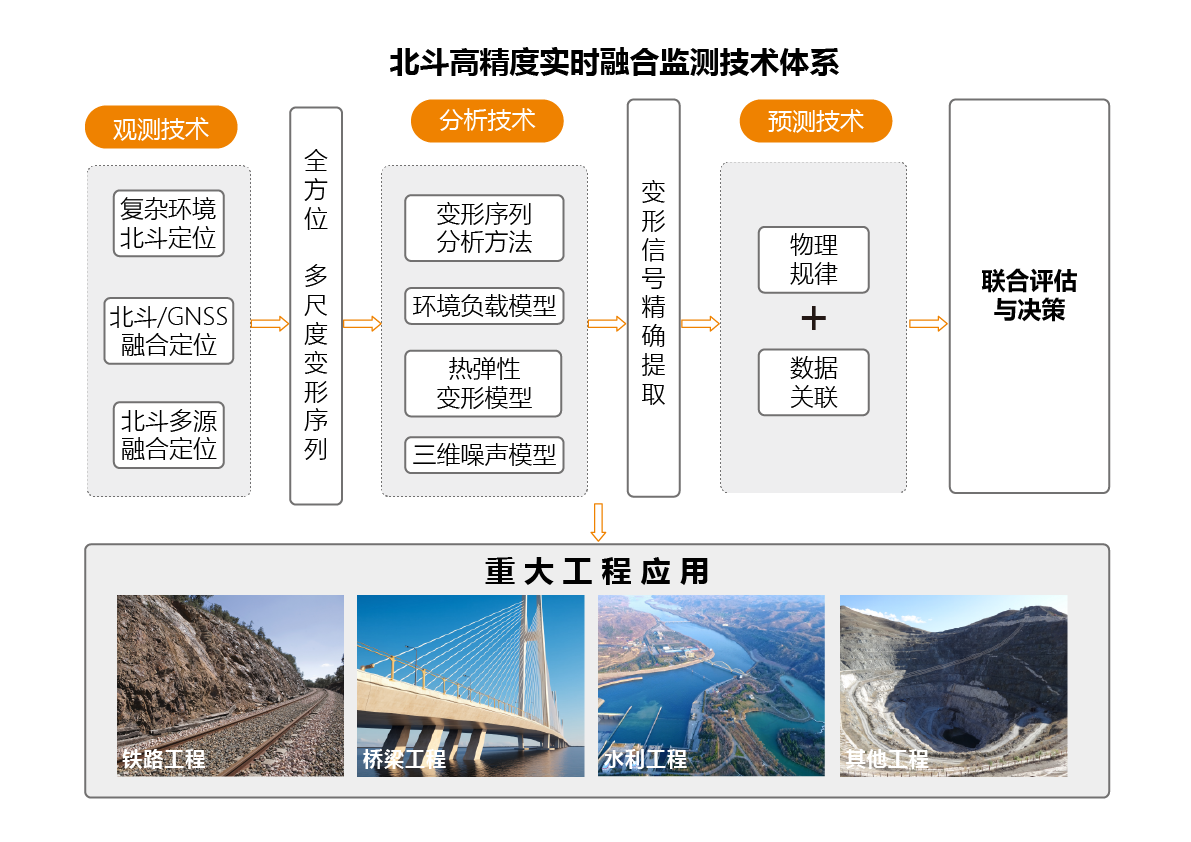 本項目面向基礎(chǔ)設(shè)施安全服役與智能運維建設(shè)的國家重大需求,在變形觀測、分析、評估和監(jiān)測平臺等多方面取得了突破性成果,形成自主創(chuàng)新的北斗高精度實時融合技術(shù)體系與監(jiān)測裝備,實現(xiàn)了集1毫米級、實時、自動、三維一體化變形監(jiān)測于一體的基礎(chǔ)設(shè)施安全監(jiān)測新模式。目前,項目成果已廣泛用于鐵路、橋梁、大壩等重大工程的安全監(jiān)測,顯著提升了我國大型基礎(chǔ)設(shè)施安全監(jiān)測和智能運維能力,推進了北斗智能融合技術(shù)的應(yīng)用和發(fā)展。