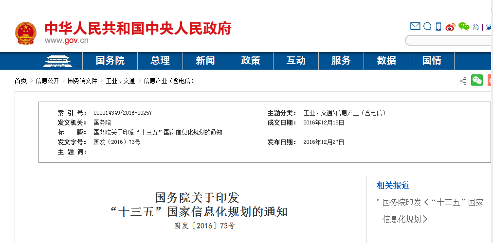 2016年《“十三五”國家信息化規(guī)劃》出臺(tái)