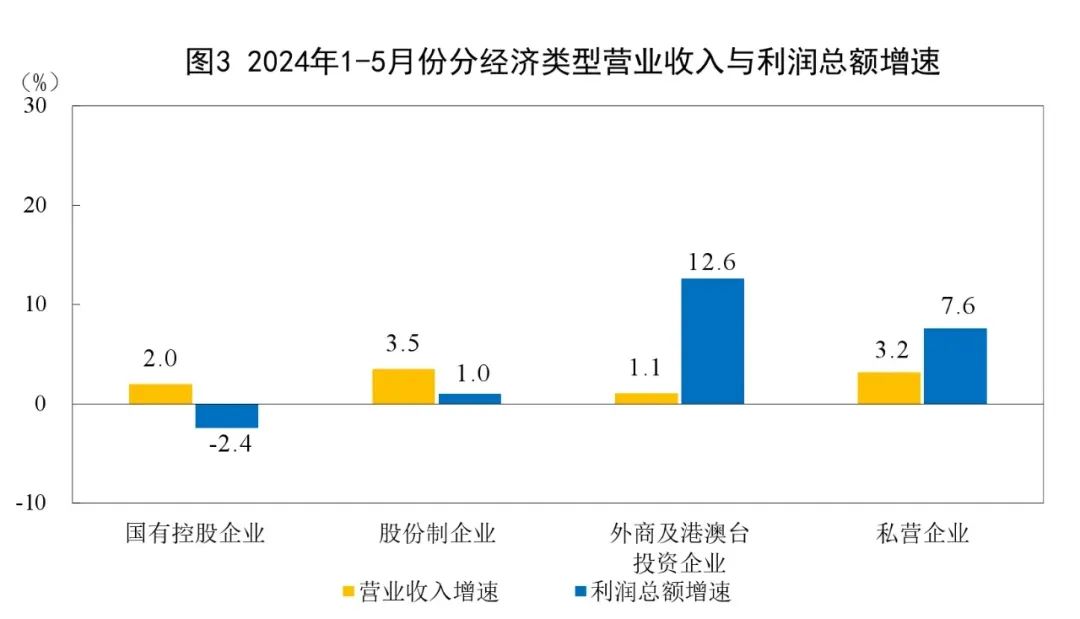 1—5月份,規模以上工業企業中,國有控股企業實現利潤總額9438.4億元,同比下降2.4%;股份制企業實現利潤總額20510.5億元,增長1.0%;外商及港澳臺投資企業實現利潤總額6827.8億元,增長12.6%;私營企業實現利潤總額7329.3億元,增長7.6%