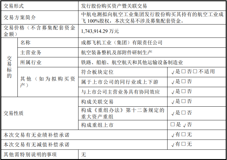 此次重組涉及公司向中國航空工業(yè)集團(tuán)發(fā)行股份,以購買其持有的航空工業(yè)成飛100%的股權(quán)。中航電測和航空工業(yè)成飛同屬于中航工業(yè)集團(tuán),屬于內(nèi)部資產(chǎn)重組。