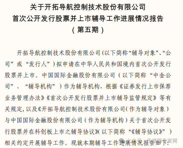 2023 年 4 月 28 日,開拓導航與中國國際金融股份有限公司簽署IPO輔導協議,截止2024年7月19日,已完成第五期輔導工作。