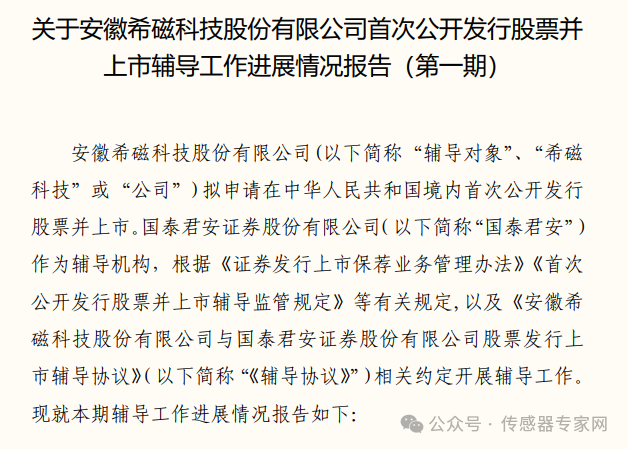 2024年4月28日,希磁科技與國泰君安簽署上市輔導協議,截止2024年7月9日,完成第一期輔導工作。