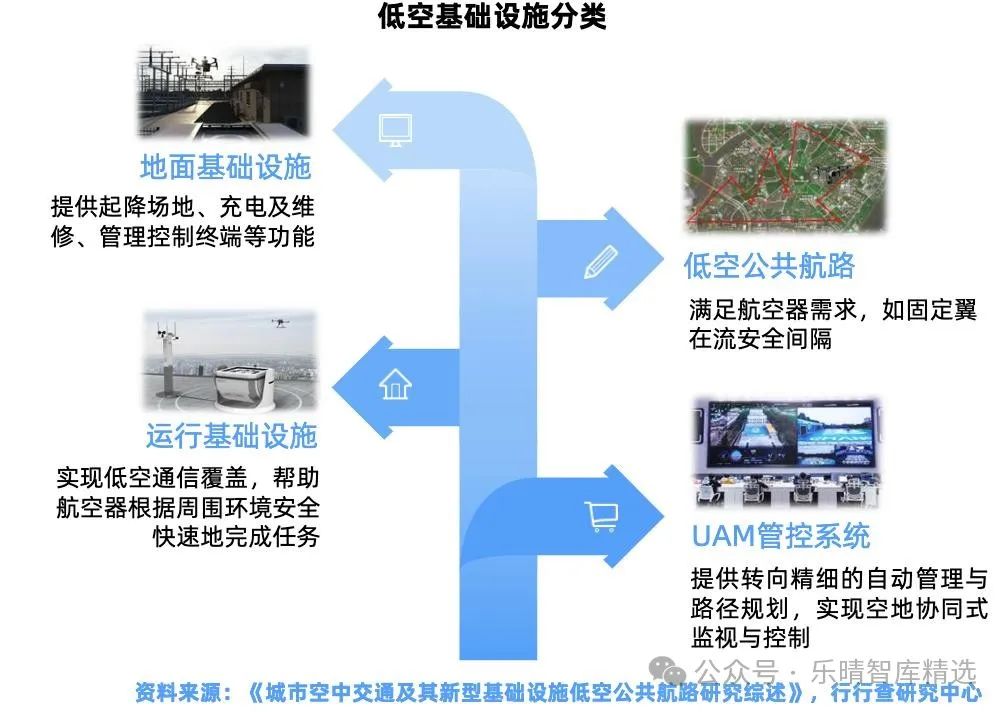 低空基礎(chǔ)設(shè)施主要由運(yùn)行和地面兩大類設(shè)施構(gòu)成,同時(shí)輔以公共航路和管控系統(tǒng)。